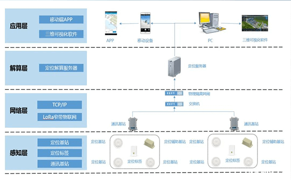 3、功能实现 通过全厂区的定位设备安装及三维建模,系统整体可实现: 3.1 人员定位 人员在三维地图上实时显示,实现身份识别、精准定位、人员快速查找与追踪、不同区域人数统计等功能。 3.2 车辆定位 实时定位作业车辆、固废车辆等位置,实现车辆信息查询,实时定位监督,跟踪车辆行驶轨迹,偏离路线报警、非法闯入报警等功能。 3.3 电子围栏 根据定位需求设置固定、临时及自动电子围栏,对闯入、靠近、超时作业等违规行为进行报警。 3.4 RFID门禁集成 定位标签卡集成RFID芯片,人员携带定位标签可作为门禁卡使用。 3.5日志报表 系统提供SOS报警日志、标签绑定与解绑日志的操作日志供查看。 现场设备安装展示