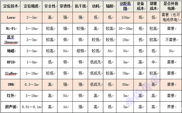 UWB人员定位技术、LORA、蓝牙、WIFI、RFID、红外线等等,各类技术在不同场景下的应用不同,企业需要根据自身对定位精度,定位场景的需要,选择合适的技术,具体参数见下表: